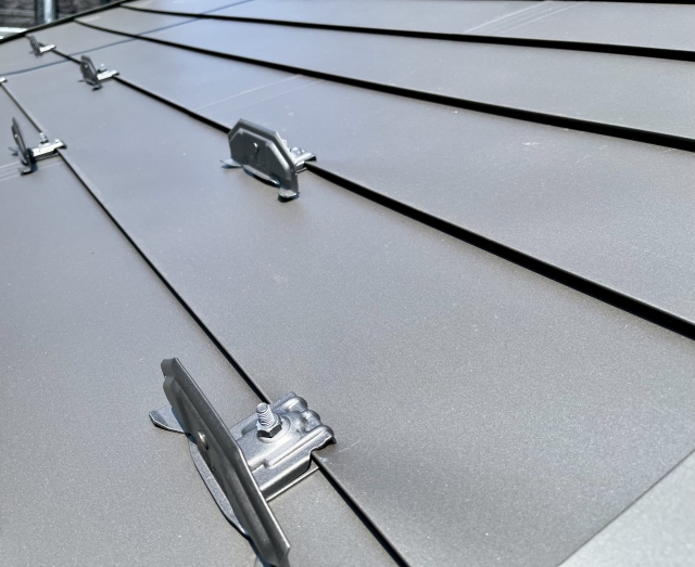 ガルバリウム鋼板屋根は非常に滑りやすく、少量の積雪でも雪が一気に落下する危険があるため、雪止め工事による落雪防止対策が重要です。施工は屋根の立ち上がり部分に専用の雪止め金具を挟み込んで固定する方法が主流で、屋根に穴を開けず後付け可能な施工も多く採用されています。玄関前やカーポートへの落雪防止、隣家への被害防止にも有効で、近年特に設置相談が増えている屋根安全対策工事の一つです‼︎