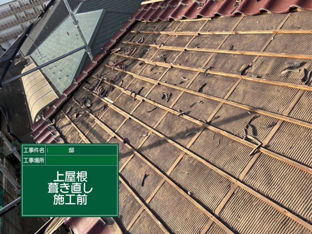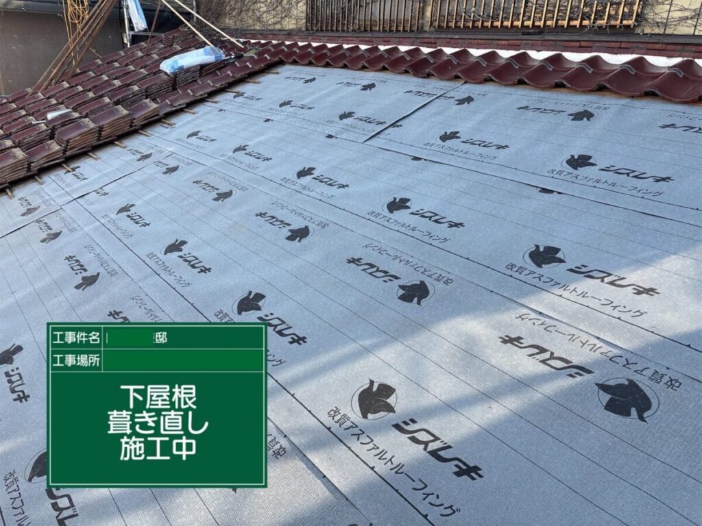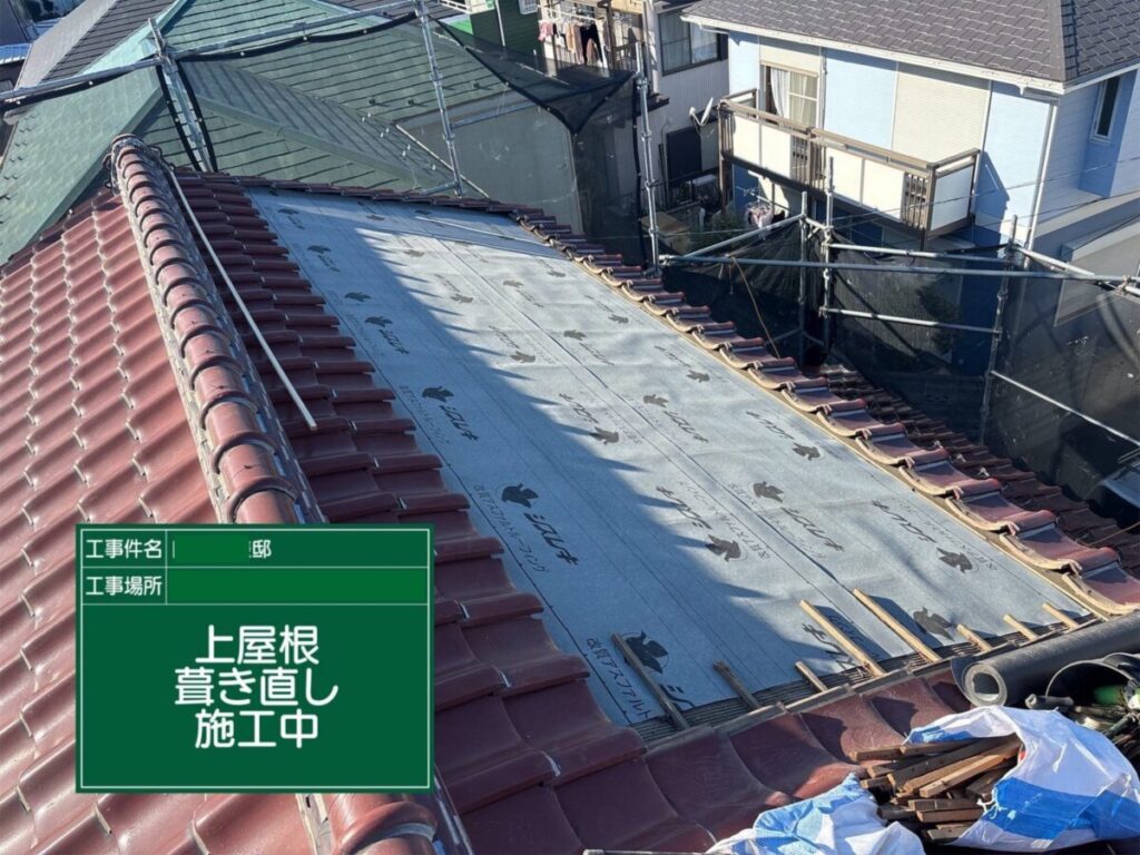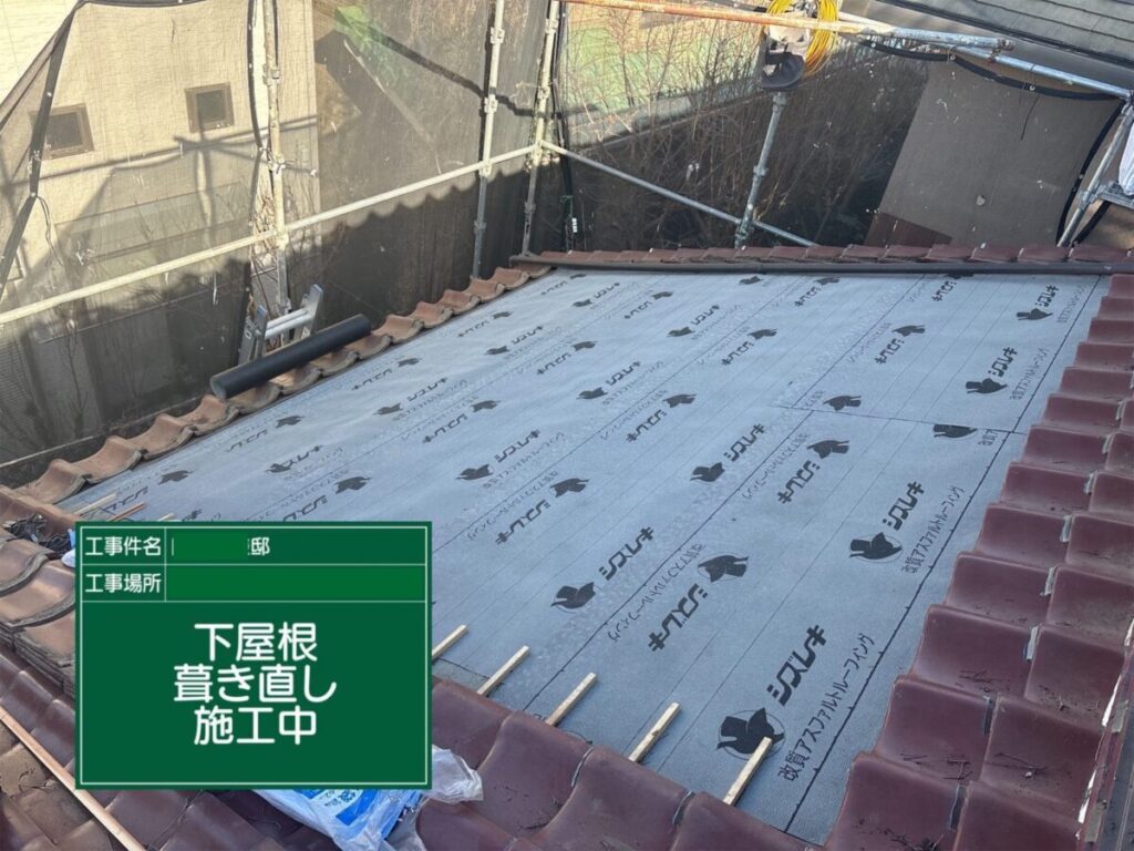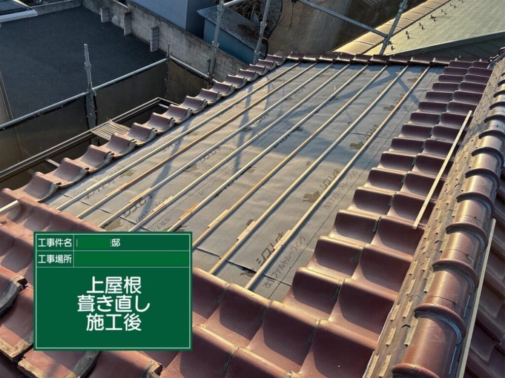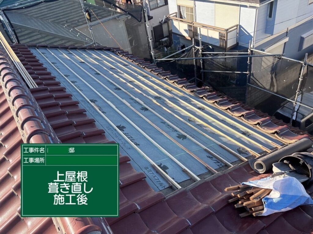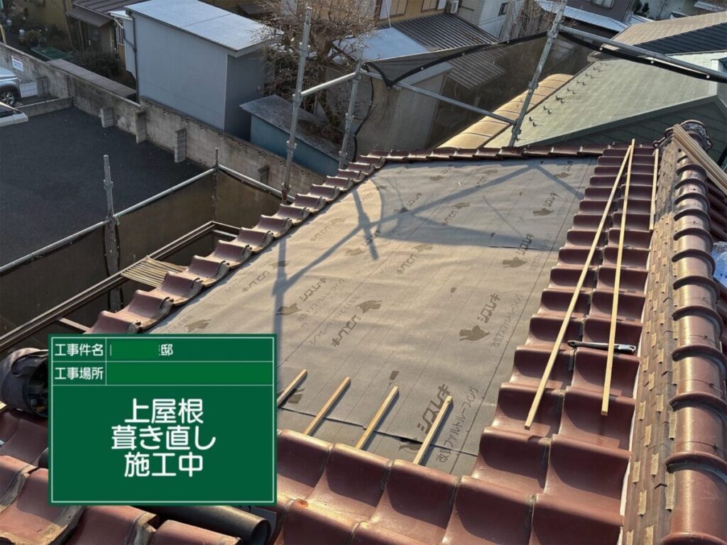 今回の葺き直し工事では、既存の瓦を再利用しながら、劣化した防水シートや瓦桟を新しく交換することで、