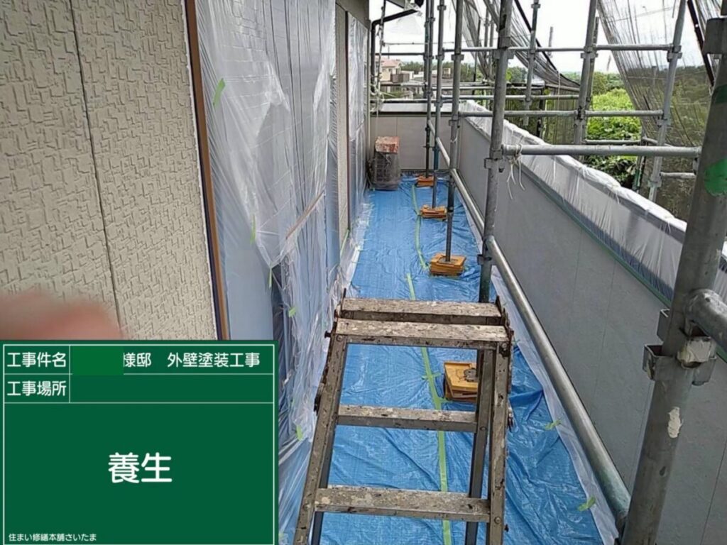 外壁塗装では、塗料が窓やドア、床、植木などに付着しないよう保護するために養生を行います。仕上がりをきれいに保つとともに、周囲や近隣への汚れ防止にもつながる大切な工程です。