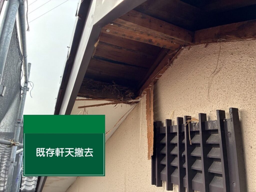 既存の軒天井材は劣化や剥がれが進行していたため、安全面を考慮し慎重に撤去作業を行いました。