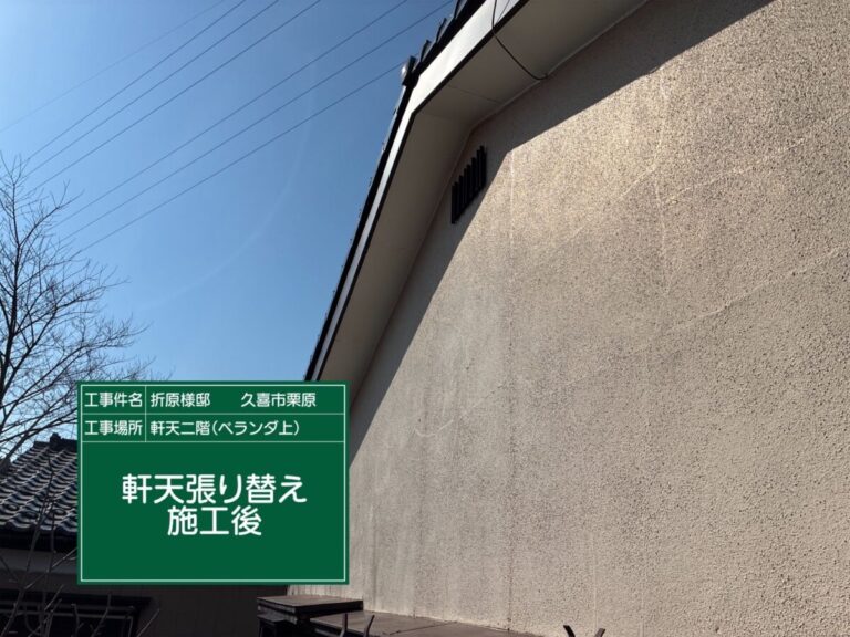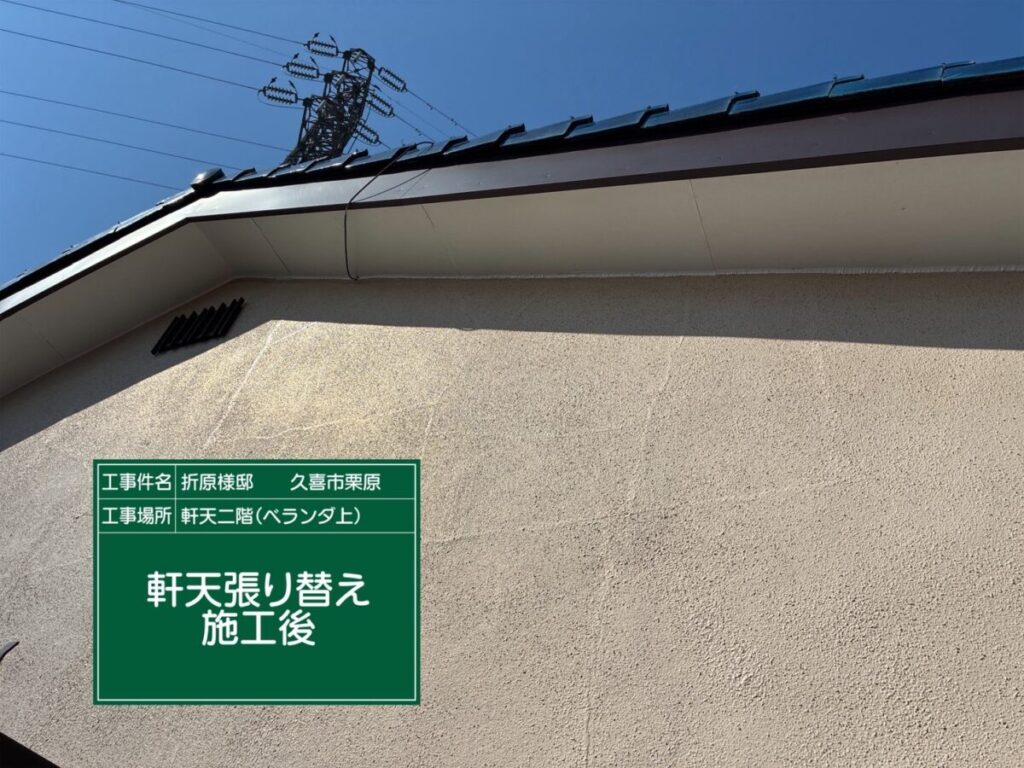 軒天井の張替工事が完了し、剥がれや浮きが見られた箇所については、新たに軒天井材を施工し直し、状態の改善を図りました。