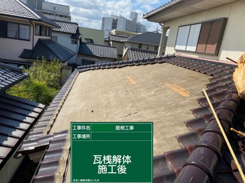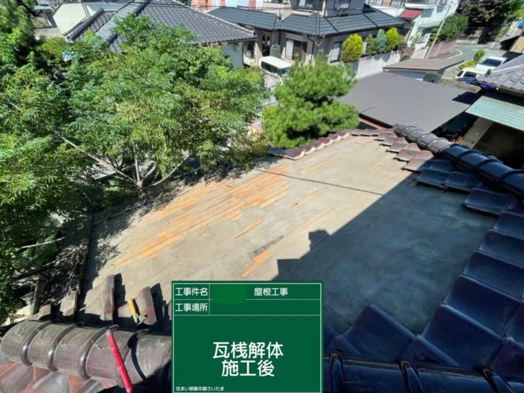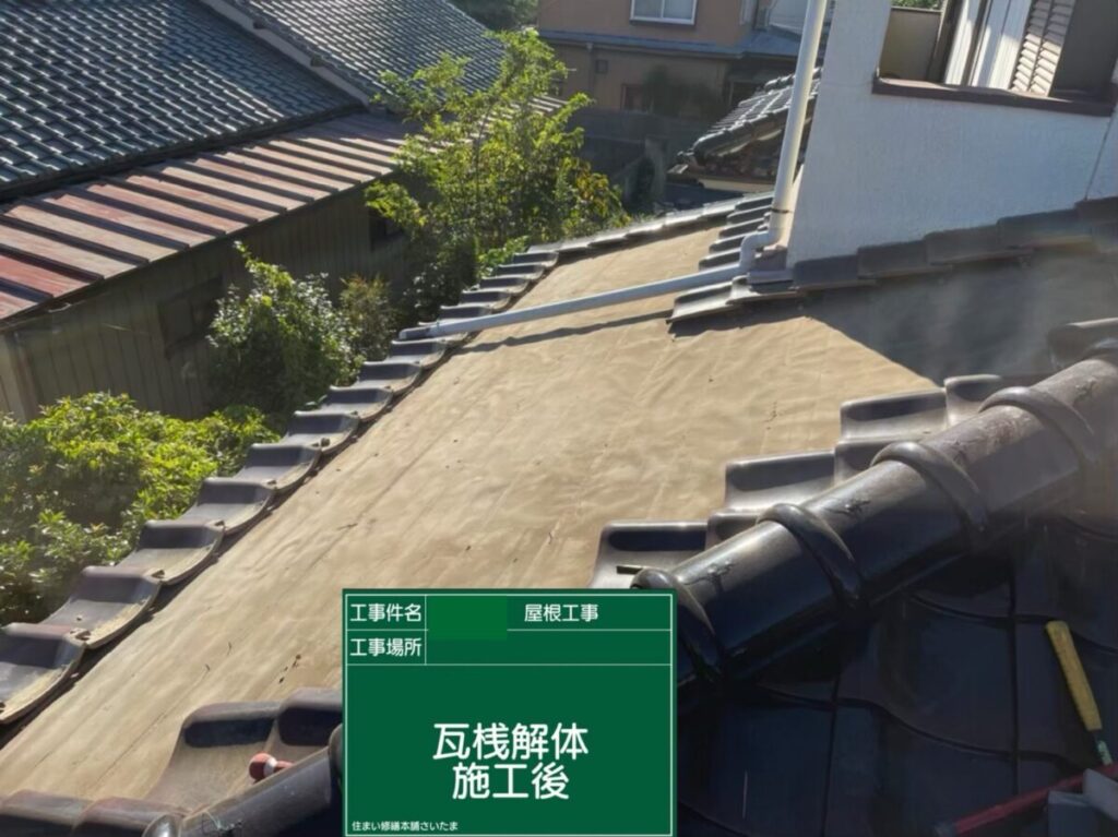 瓦桟を撤去すると既存のルーフィング(防水シート)が現れます。長年の経年劣化により、部分的に破れや傷みも確認できました。この状態を放置すると、いずれ雨水が浸入し雨漏りにつながる恐れがあるため、今回しっかりと新しい防水層へと施工していきます。