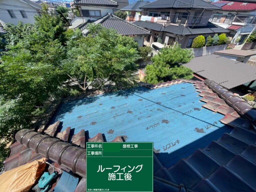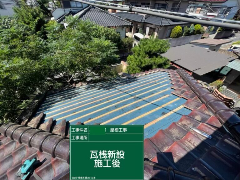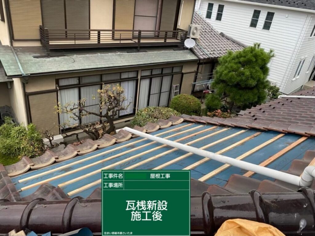 新しいアスファルトルーフィング施工後、瓦を固定するための瓦桟を新設していきます。瓦桟は瓦を正確な位置に並べ、ズレや落下を防ぐ重要な役割を担っています。屋根全体の寸法を確認しながら一本一本丁寧に設置し、その後既存瓦を復旧して葺き直し工事は完了となります。防水層を新しくしたことで、見えない部分から屋根の性能が回復し、今後も安心して暮らせる住まいへと生まれ変わりました。